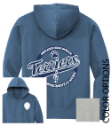 District Perfect Weight Fleece Hoodie with Screen Print Design: Redlands Instrumental Band Design - Full Front & Full Back. Color: Heathered Steel and Maritime Blue | Size(s): Adult Sizes: XS-4XL